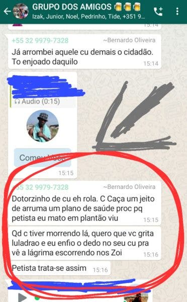 “C [você] caça um jeito de arruma um plano de saúde proc pq petista eu mato em plantão viu” (sic), disse o médico em um grupo de WhatsApp.